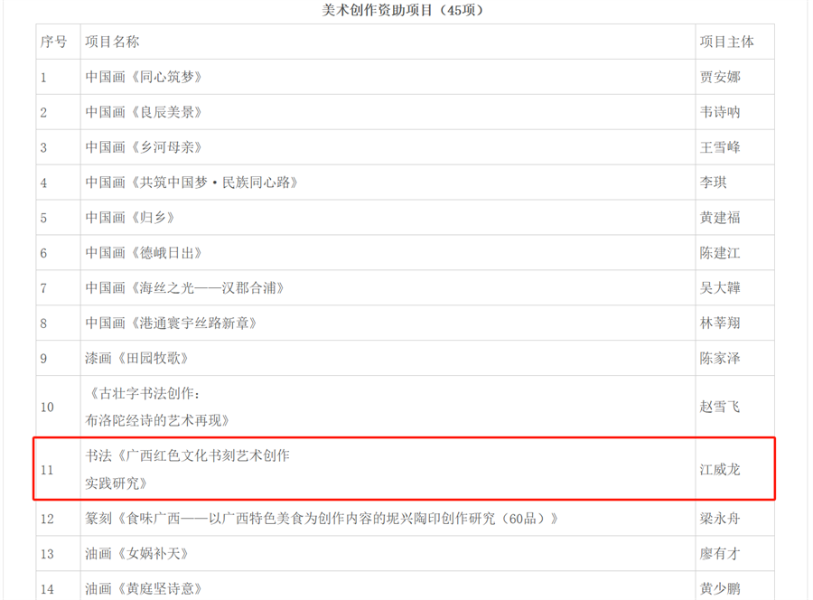 据悉,广西艺术基金是我国第六支、少数民族自治区首支省级公益性艺术基金,广西艺术基金作为广西壮族自治区为推进艺术创作、培养艺术人才而设立的专项基金,每年吸引大量高水平的艺术项目申请。在众多申报项目中,美术创作资助项目有45项获立项资助,3项书法创作人才项目获资助。此次立项实现了我校书法学院在省级艺术基金书法类项目申报“零的突破”,展现了学院艺术创作的核心竞争力。