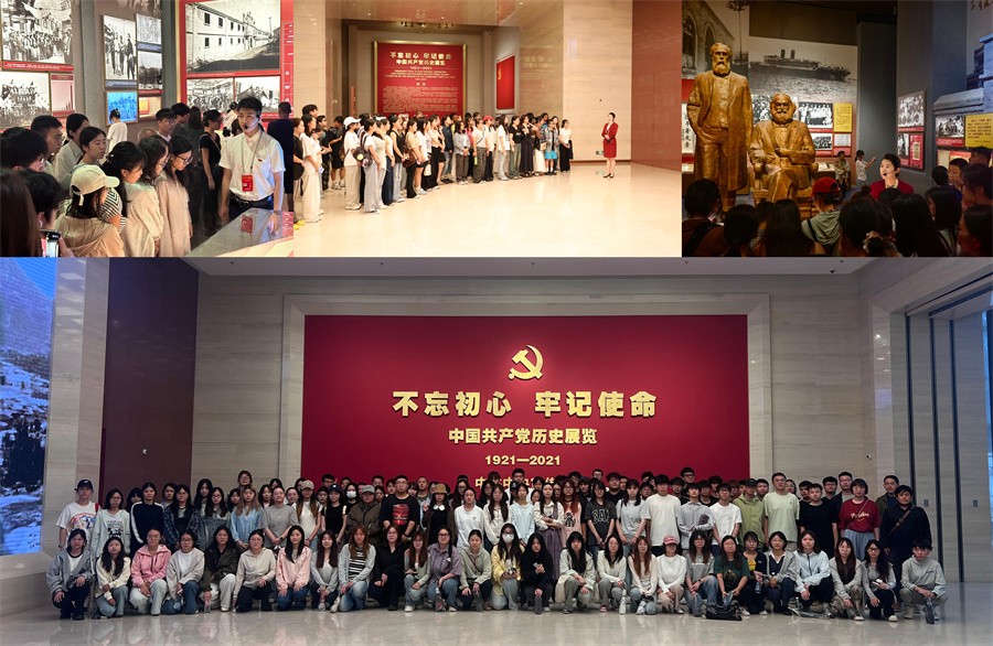 考察师生还共同走进中国共产党历史展览馆,庄严肃穆的氛围瞬间将大家带入波澜壮阔的历史长河。在“抗日战争”主题展区,师生驻足于泛黄的抗战家书、锈迹斑斑的武器装备、定格历史瞬间的黑白影像前,认真聆听讲解员讲述中国共产党带领全国各族人民浴血奋战、抵御外侮的英雄事迹。