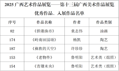 近日,由广西壮族自治区人民政府主办的2025广西艺术作品展览——第十三届广西美术作品展览作品评选结果正式公布。我校美术学院4位教师的作品成功入展,分别涉及摄影专业、绘画专业、雕塑专业。