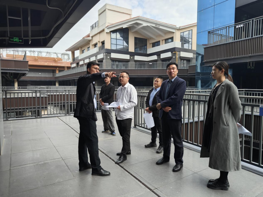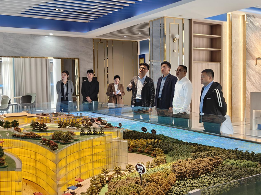 考察期间,在广西旅发沿海投资有限公司党委委员、副总经理宣首的陪同与讲解下,代表团通过项目沙盘全面了解广旅奥特莱斯小镇的地理区位优势与整体商业规划。据介绍,该小镇地处区域核心交通枢纽,依托周边丰富的文旅资源与高密度消费人群,定位为集购物消费、艺术展示、旅游体验于一体的复合型商业综合体,具备开展校企合作的良好基础。