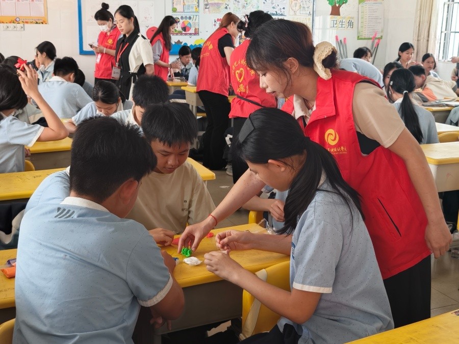 活动班会以“缅怀革命先烈,传承红色基因”为核心,紧扣清明节缅怀先烈、致敬英雄的传统,结合北海本土红色资源,充分发挥文学院学子专业特长,共分为12个小组分别进入小学班级开展活动。活动现场,志愿小组化身“红色导师”,以生动鲜活的叙事方式,系统讲述了广东南路地区首位女共产党员钟竹筠烈士坚守信仰、英勇就义的革命壮举,再现了地角女民兵“不爱红装爱武装”的坚守担当,重温了解放涠洲岛的峥嵘岁月,让本土红色历史可感可触、入脑入心。在手工实践环节,志愿者耐心指导小学生制作和平鸽黏土作品,将对先烈的缅怀之情、对和平的美好向往融入指尖创作,使红色精神在实践体验中落地生根。班会尾声,各班级举行庄严宣誓仪式,“铭记红色历史、传承革命薪火、争做时代新人”的铿锵誓言回荡在校园,让学生在仪式感中深化对清明缅怀先烈意义的认知,坚定听党话、跟党走的理想信念。