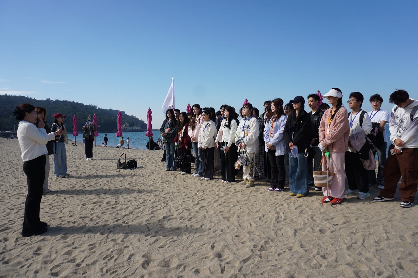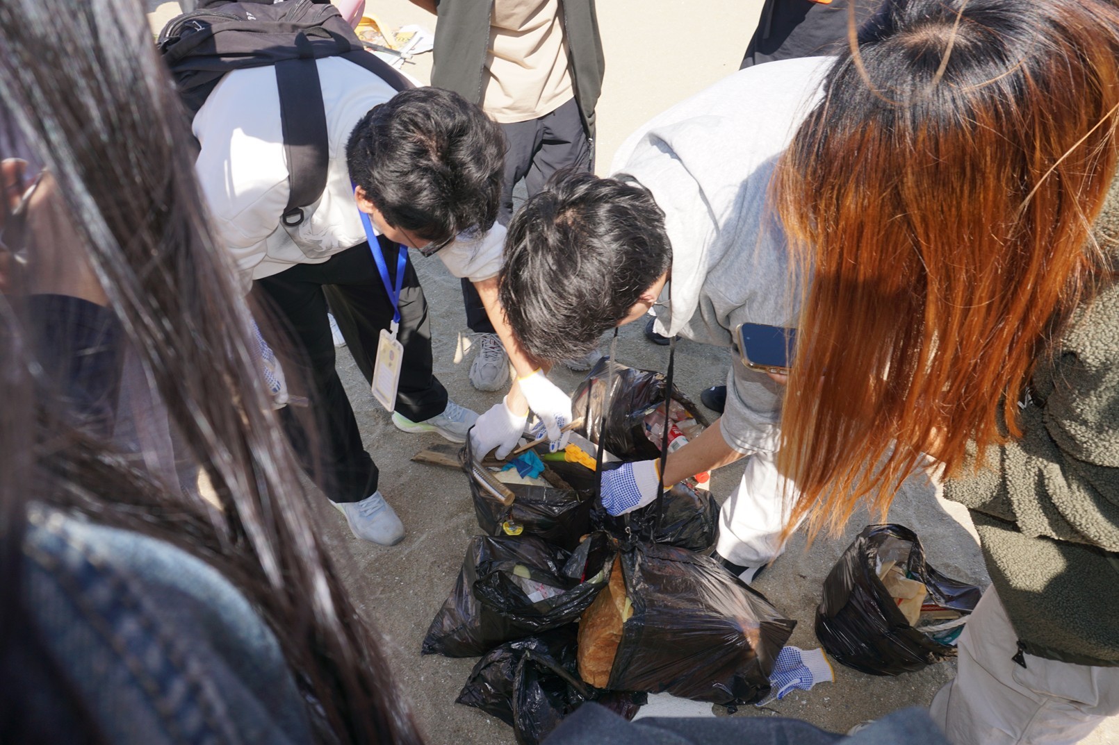 随后,工作人员通过抽签将同学们分为六组,并发放清理工具,开展“净滩护海”环保挑战赛。各小组认真捡拾塑料瓶、烟蒂等垃圾,并进行规范分类与称重记录。活动增强了同学们的生态文明意识与集体荣誉感。